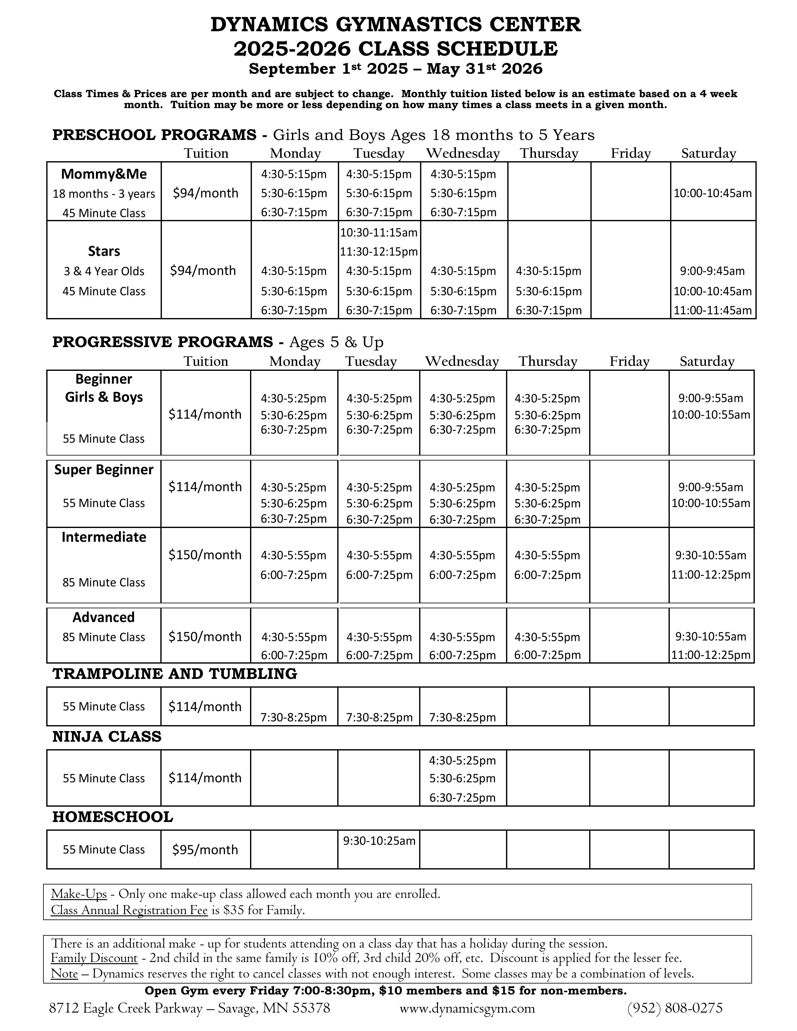 Dynamics Gymnastics Center offers all different types of gymnastics classes. Please visit our Rec. Classes Schedules tab for a current calendar of available classes, it also includes a brief description of all the classes we offer. For more details, call Dynamics Gym today (952) 808-0275. Registration is on-going throughout the year.